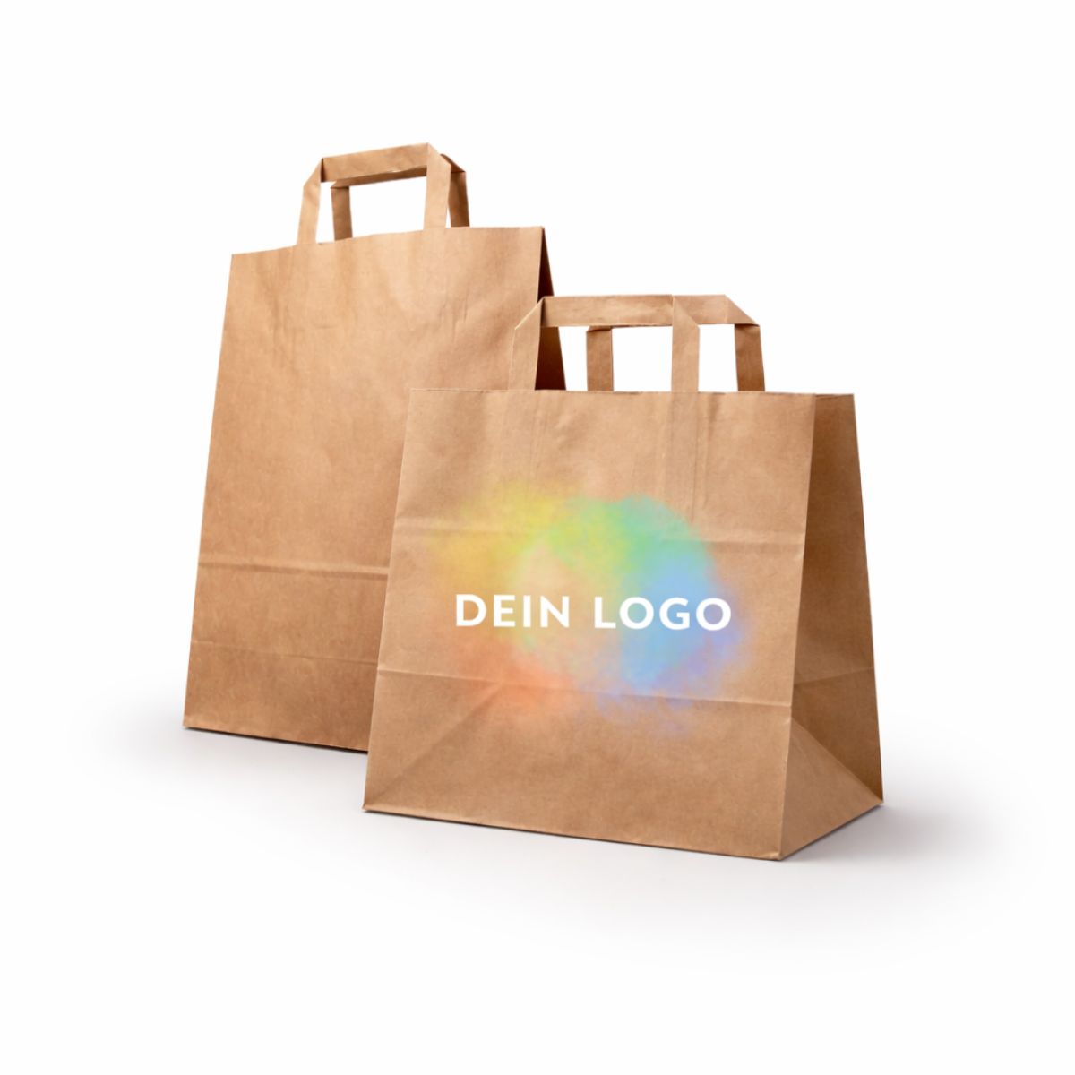 Papiertragetaschen werden in der Regel im Offsetdruck oder Flexodruck bedruckt. Beide Verfahren ermöglichen einen hochwertigen und klaren Logodruck. Je nach Design können 1 bis 4 Druckfarben verwendet werden. Dabei gilt: Je mehr Farben dein Motiv enthält, desto aufwendiger ist die Produktion. Für jede Druckfarbe werden separate Druckplatten erstellt, weshalb je nach Farbanzahl einmalige Drucknebenkosten entstehen.
