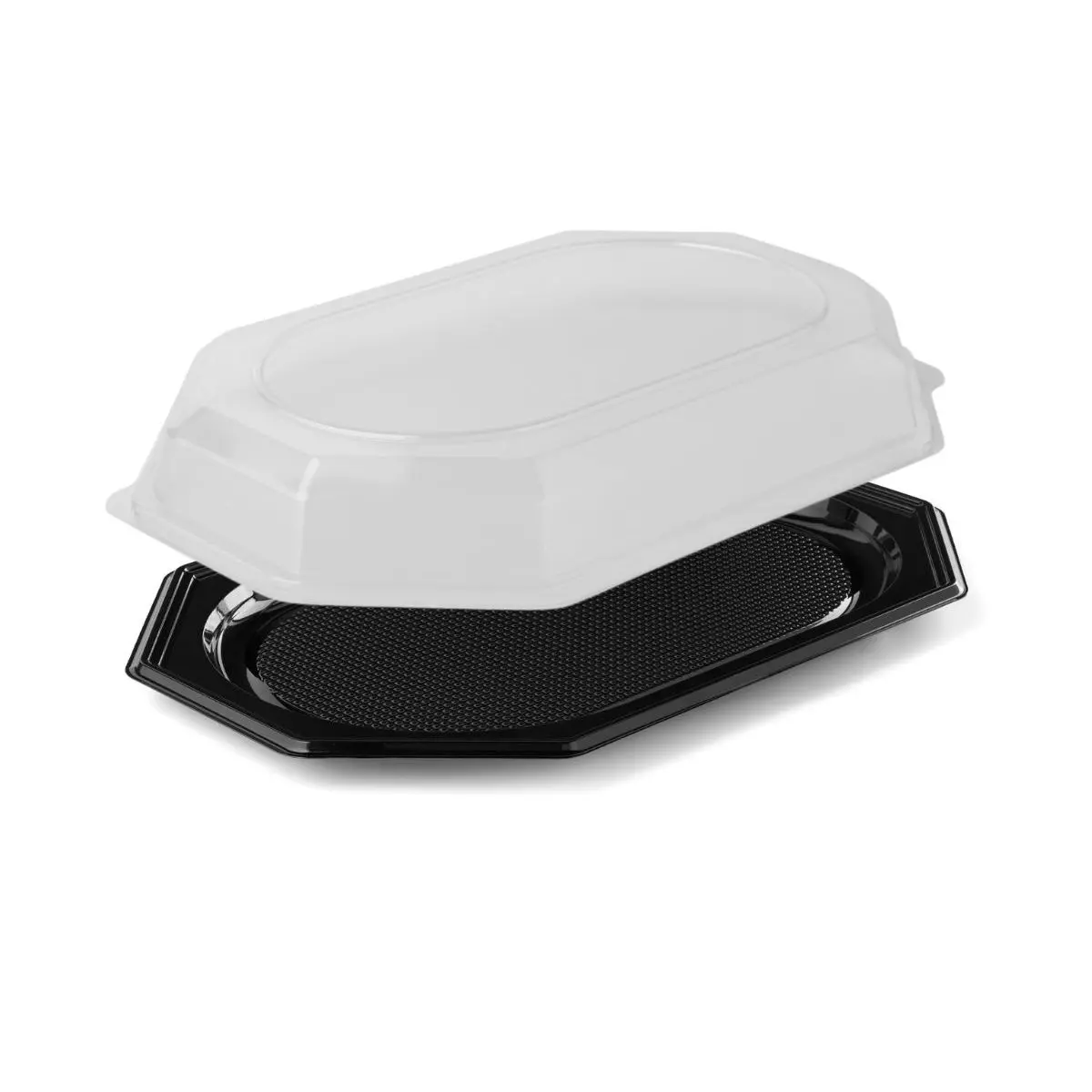 Die passenden transparenten Deckel für die 8-eckigen Sushi Menüplatten sorgen für einen zuverlässigen Schutz Deiner Speisen und runden die hochwertige Präsentation perfekt ab. Durch das klare Material bleibt der Inhalt jederzeit gut sichtbar – ideal für eine ansprechende Warenpräsentation im Kühlregal, beim Catering oder im Take-away.